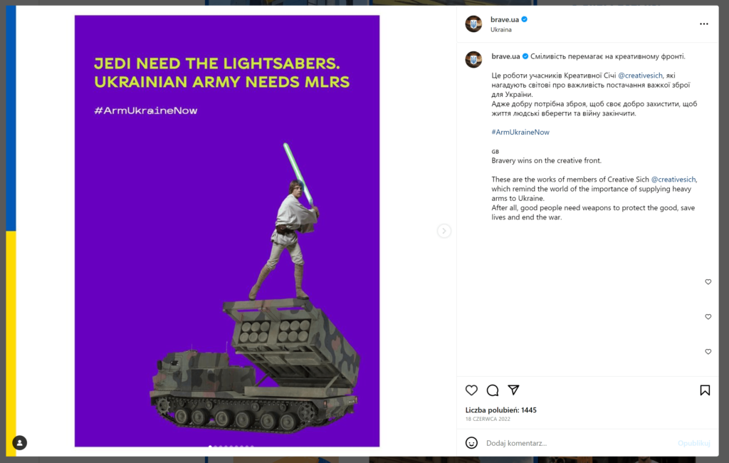 | Treść obrazu | Materiął przedstawia Luka Skywalkera, postać z megahitu filmowego „Gwiezdne wojny”, trzymającego w rękach świetlny miecz i stojącego na wyrzutni rakiet mlrs. Hasło brzmi: Jedi potrzebują świetlnych mieczy, ukraińska armia potrzebuje wyrzutni MLRS. Materiał stanowi apel do środowiska międzynarodowego o wsparcie militarne. |