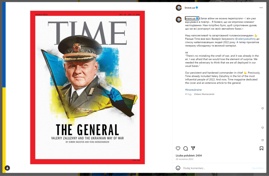 | Treść obrazu | Obraz przedstawia okładkę magazynu Time, na którym widnieje podobizna generała Załużnego. Z komentarza dowiadujemy się, że w 2022 roku generał znalazł się na liście najbardziej wpływowych ludzi na świecie. |