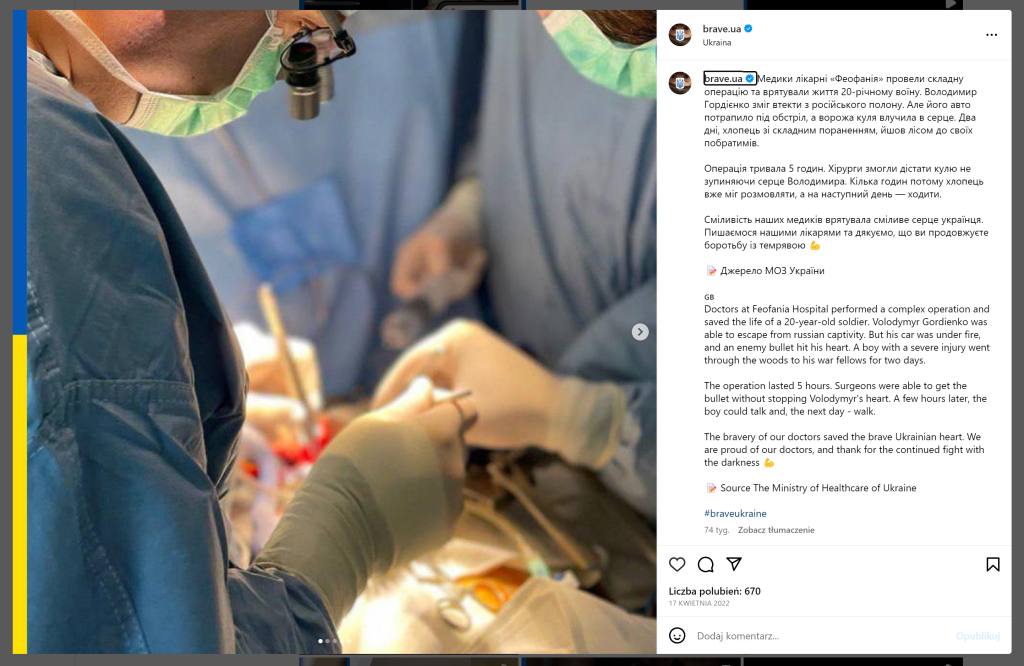 | Treść obrazu | Materiał składa się z kilku zdjęć przedstawiających pracę personelu medycznego kijowskiego szpitala kardiologicznego Feofania. Jedno ze zdjęcie w „karuzeli” przedstawia 20-letniego ukraińskiego żołnierza, Volodymyra Gordienko, który został przez medyków uratowany po ucieczce z rosyjskiej niewoli, w trakcie której został trafiony kulą w serce. Chirurdzy z Feofanii usunęli kulę, a kilka godzin później chłopak był w stanie mówić i chodzić. |