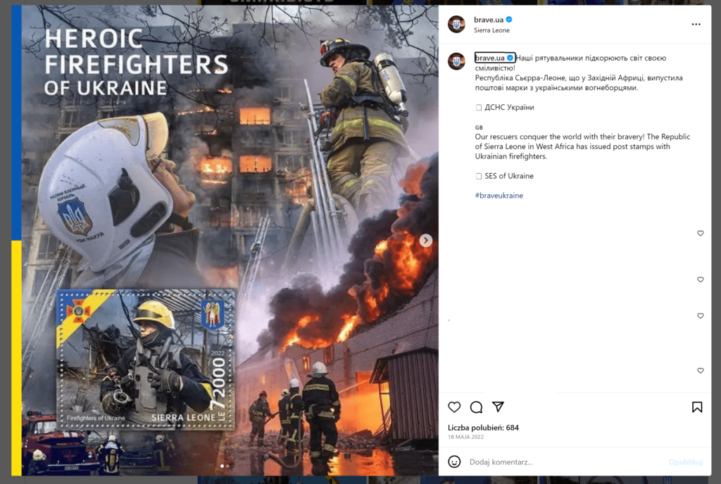 | Treść obrazu | Materiał wizualny to zdjęcie znaczka pocztowego wydanego w Republice Sierra Leone. Znaczek przedstawia ukraińskich strażaków. Tło materiału to kolaż scen przedstawiających strażaków walczących z pożarem w dzielnicy mieszkalnej, prawdopodobnie spowodowanym rosyjskim ostrzałem. |