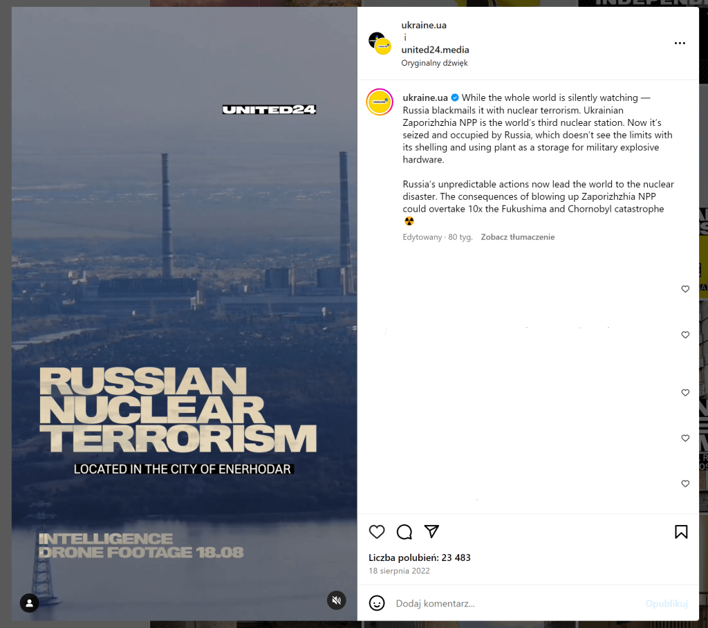 | Treść obrazu | Film (w języku angielskim) opowiada o zajętej przez rosyjskie wojska elektrowni atomowej w Zaporożu i potencjalnym zagrożeniu, jakie stanowi ona – pozostając w rękach wroga – dla Ukrainy, Europy i całego świata. Materiał składa się z map, które pokazują strategiczne położenie elektrowni, zdjęć satelitarnych, które dowodzą, że Rosjanie zaatakowali strategiczną infrastrukturę i wizualizacji alarmujących o planach przejęcia elektrowni i zasilania z jej zasobów terenów okupowanych przez Rosję. |
